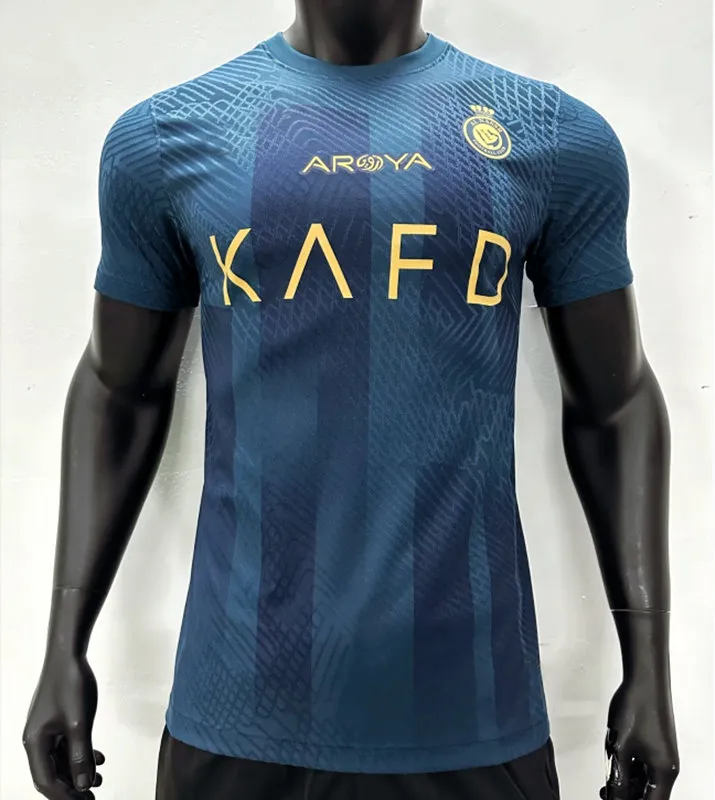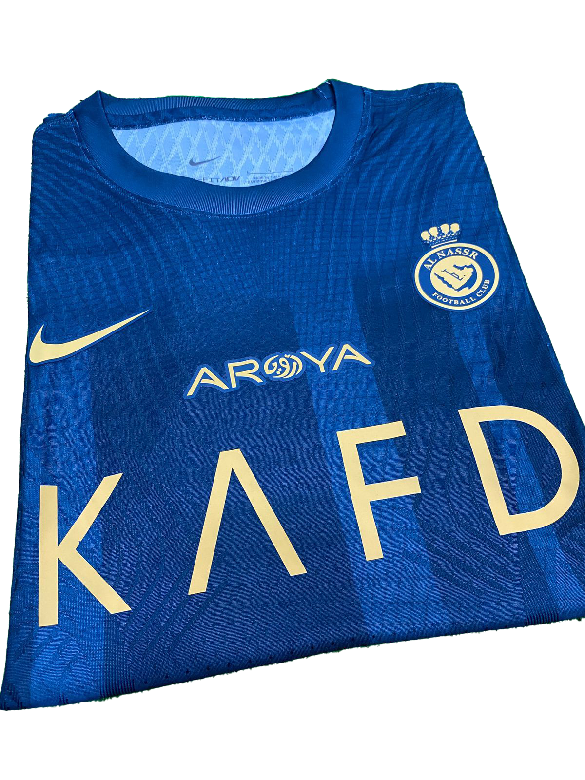 Al-Nassr FC 23/24 Away Shirt – Official Nike Navy & Gold Jersey Experience football in a new way with the Al-Nassr FC Away Jersey for the 2023/2024 season, now made by Nike. The jersey features the team’s bright colors, showing the pride of Al-Nassr fans. Made from high-quality, sweat-wicking fabric, it keeps you comfortable whether you’re playing or watching the game. The official club badge is on the jersey, so you can show your support for Al-Nassr with pride. Join other fans and enjoy the new season in style. Get your 23/24 jersey now and be part of Al-Nassr FC’s journey with Nike.